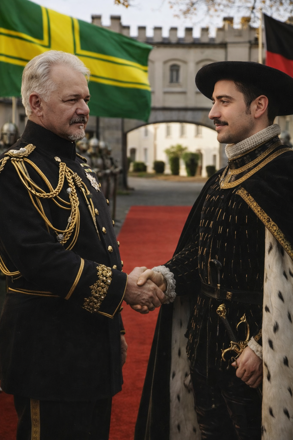 Quando o Rei da Nova Normandia desceu do veículo e avançou pelo tapete vermelho, foi recebido pessoalmente pelo Rei de Württemberg. O aperto de mãos entre ambos foi visivelmente firme e demorado e foi igualmente capturado pelas lentes presentes. Não se tratava de cumprimento casual entre velhos conhecidos; era imagem cuidadosamente enquadrada para atravessar semanas, talvez meses, de especulação na velha Europa e na América.